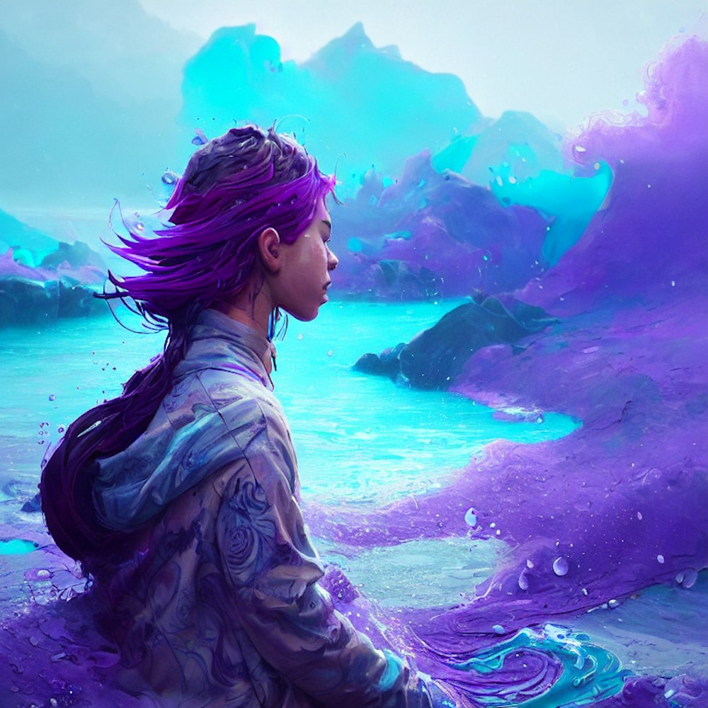 girl with a purple blue backround for a phonk cover, add a water splashes and dynamics, add fog and glitch