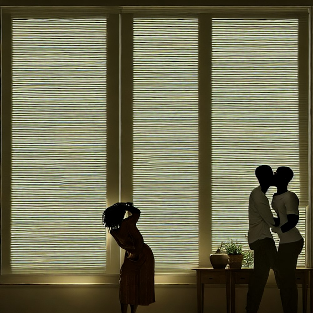 african american couple kissing at window blinds