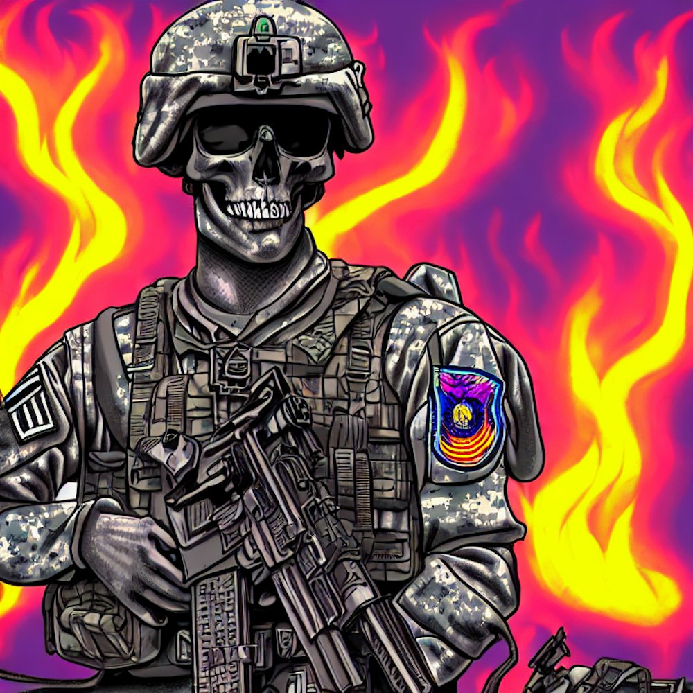 Vaporwave comic + army soldier + background flames and skulls