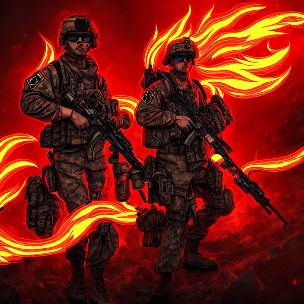 Neon comic + army soldier + background flames and skulls