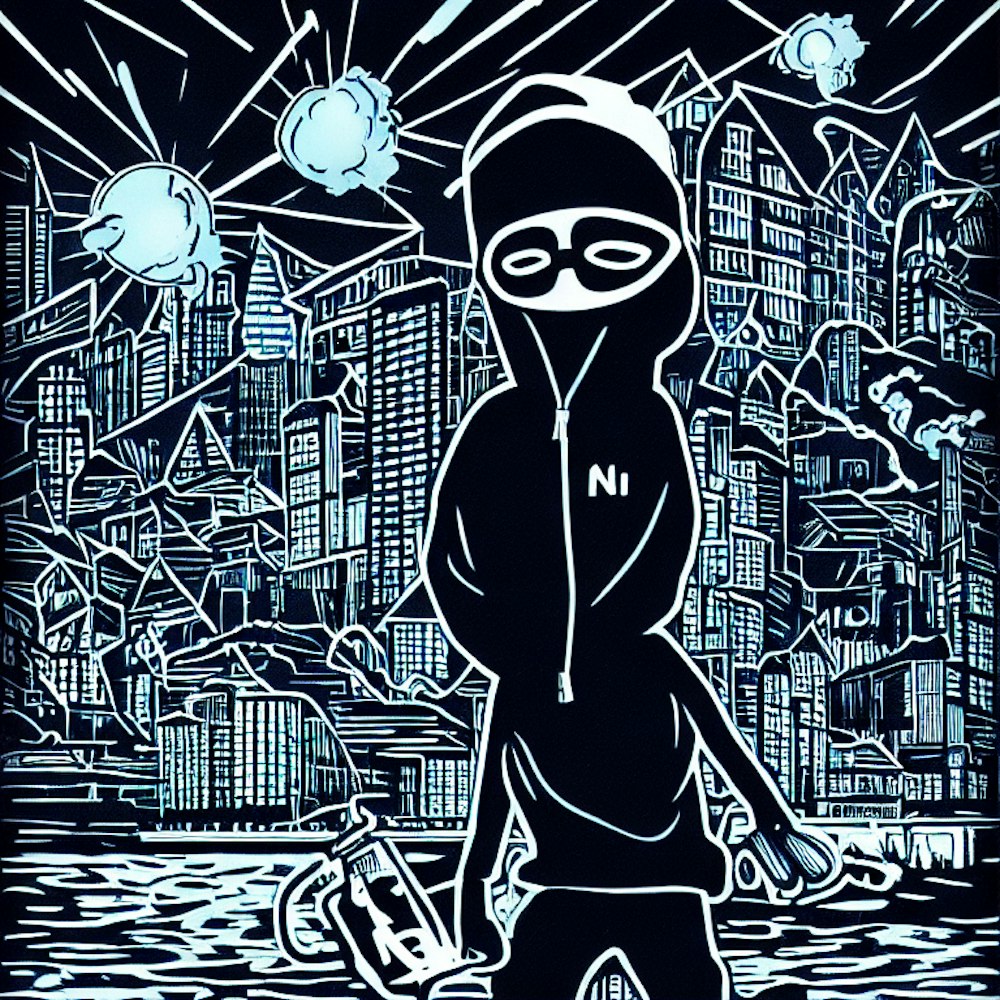 dark blue drawing of a single, one, singular cool rapper with ski mask who is smoking and has cool clothes in the night next to the river for song cover