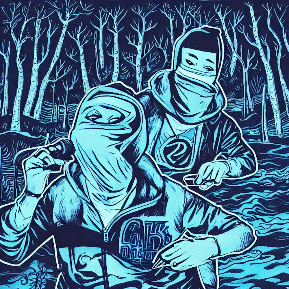 dark blue drawing of a single, one, singular cool rapper with ski mask who is smoking and has cool clothes in the night next to the river for song cover