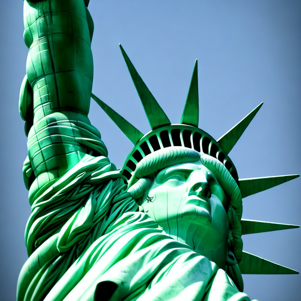 a close photo of the hand of the Statue of Liberty, holding the torch, rusty, green post apocalypse