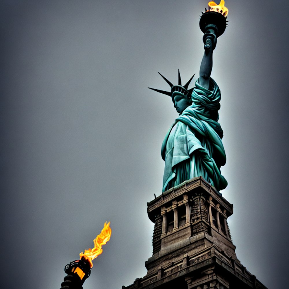 a realistic accurate close photo of the hand of the Statue of Liberty holding the torch, rusty and mossy, abandoned, grey sky get dark