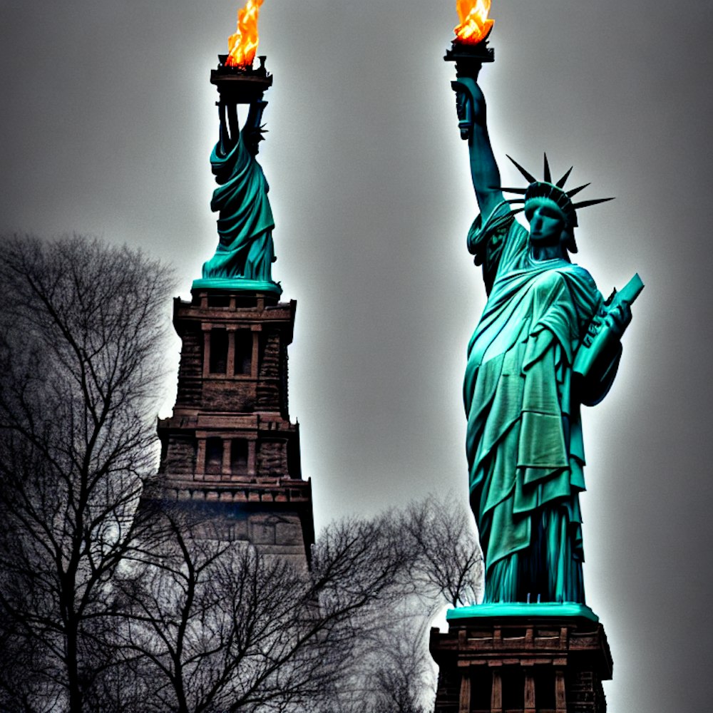 a realistic accurate close photo of the hand of the Statue of Liberty holding the torch, rusty and mossy, abandoned, grey sky get dark