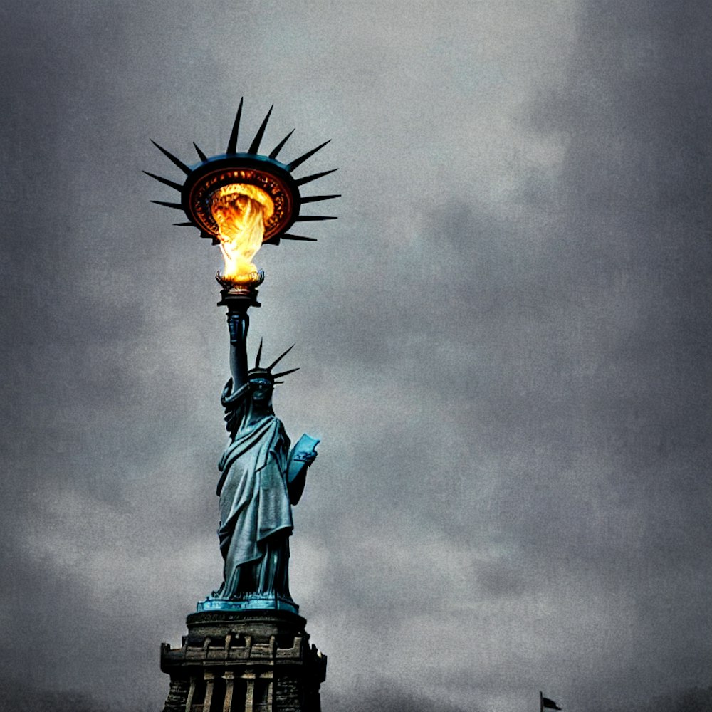 a realistic accurate close photo of the Hand of the Statue of Liberty holding the torch, rusty and mossy, abandoned, grey sky get dark