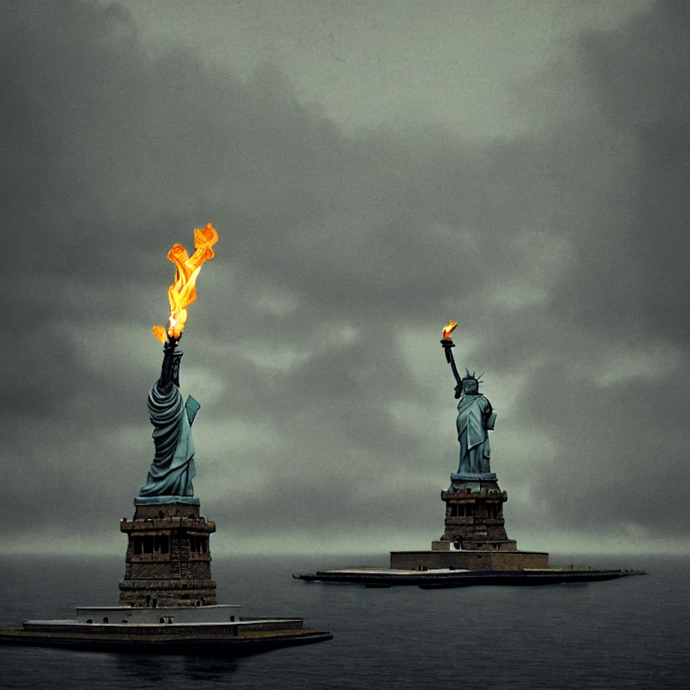 a realistic accurate close photo of the Hand of the Statue of Liberty holding the torch, rusty and mossy, abandoned, grey sky get dark