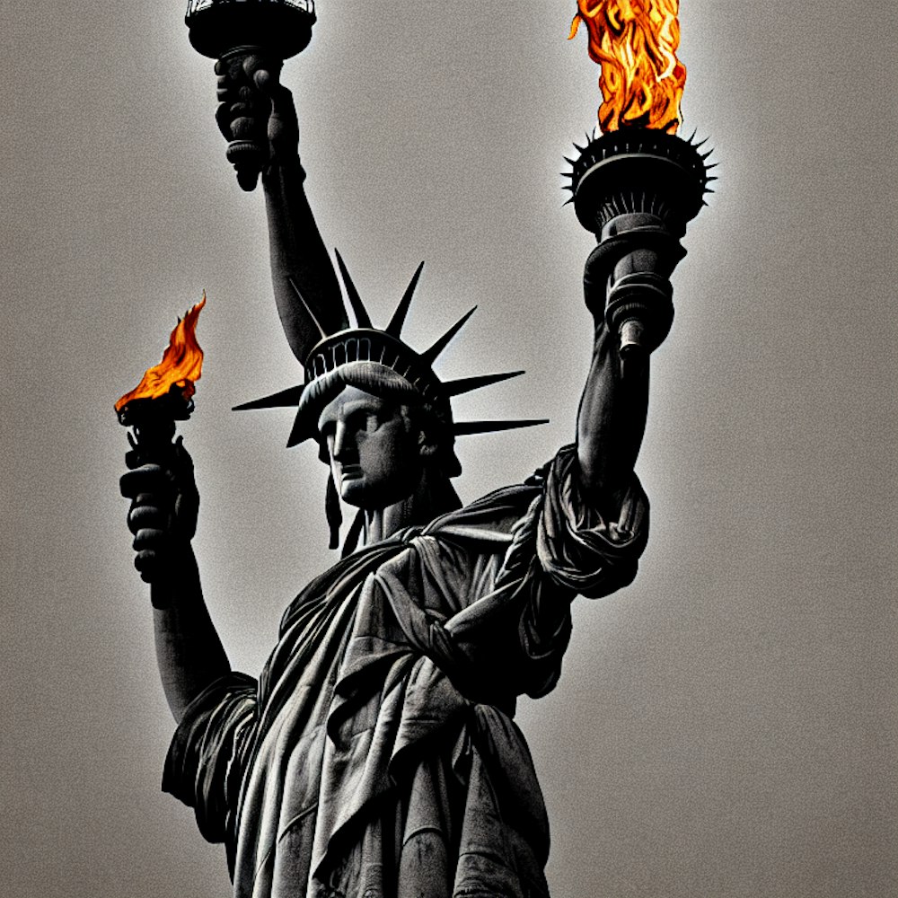 a realistic accurate close photo of the Hand of the Statue of Liberty holding the torch, rusty and mossy, abandoned, grey sky get dark, like the poster of Civil War movie