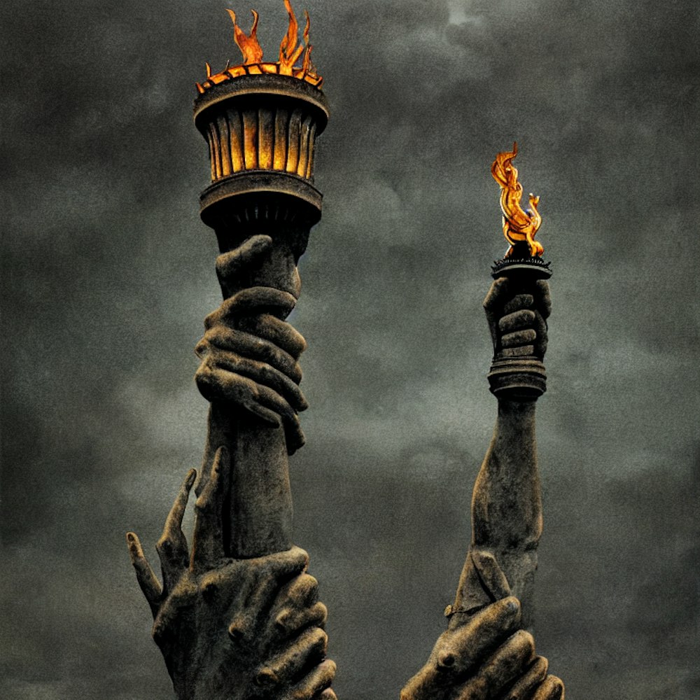 a realistic accurate close photo of the Hand of the Statue of Liberty holding the torch, rusty and mossy, abandoned, grey sky get dark, like the poster of Civil War movie