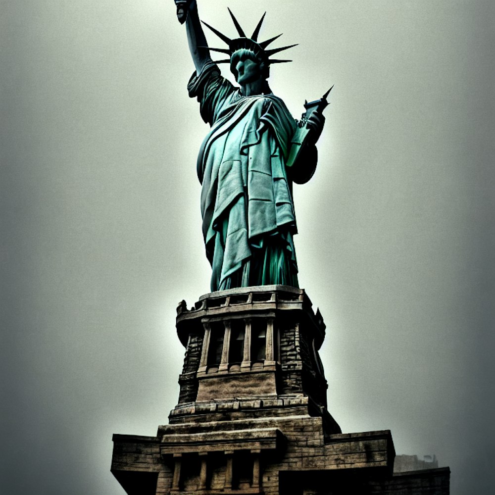 a realistic accurate close photo of the Hand of the Statue of Liberty holding the torch, rusty and mossy, abandoned, grey sky get dark, like the poster of Civil War movie
