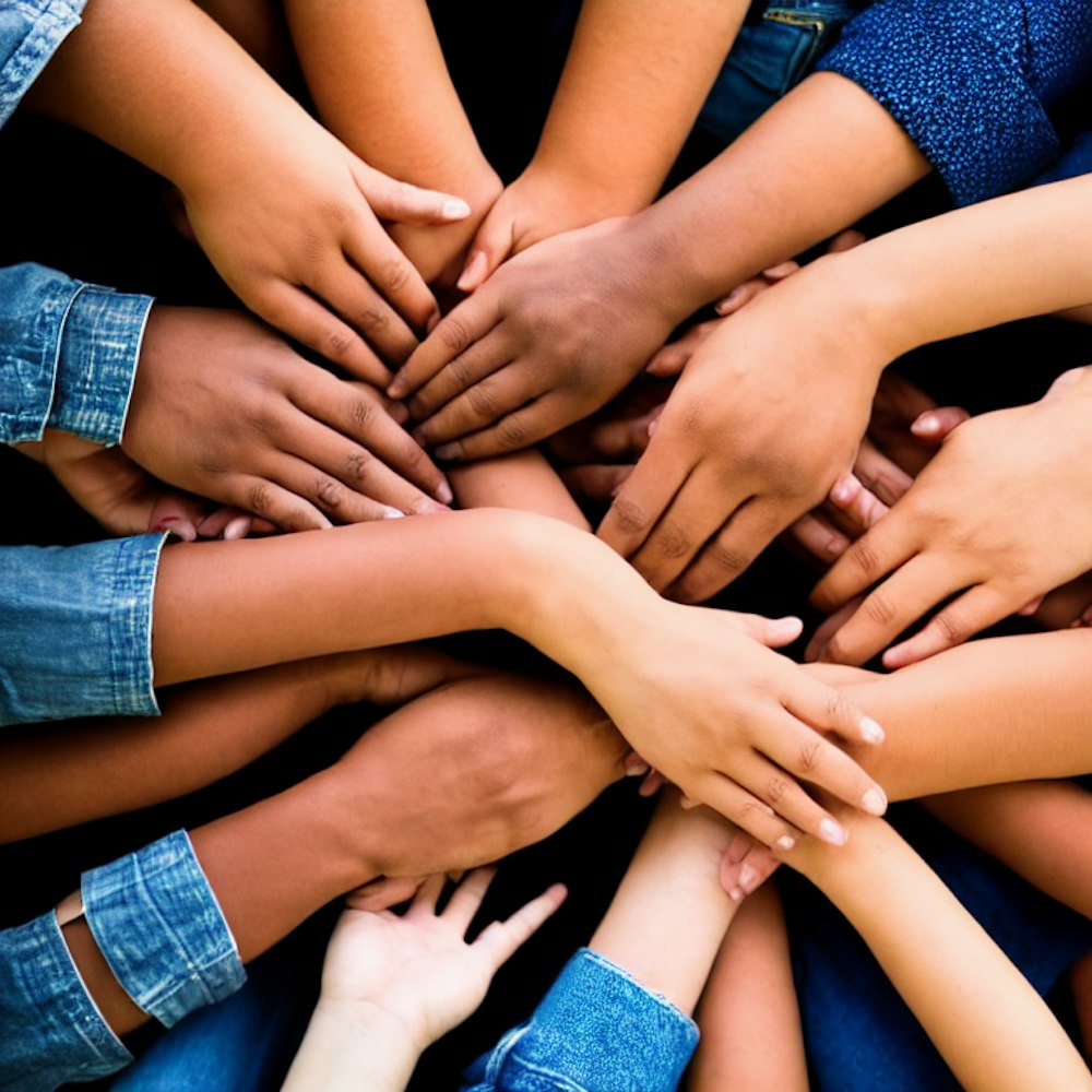 a top down picture of diverse ethnic hands all grabbing each others arms in a circular pattern, photo realism, accurate fingers and hands