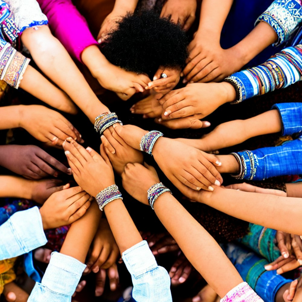 a top down picture of diverse ethnic handsall grabbing each others arms in a circular pattern, different culture clothing, photo realism, accurate fingers and hands