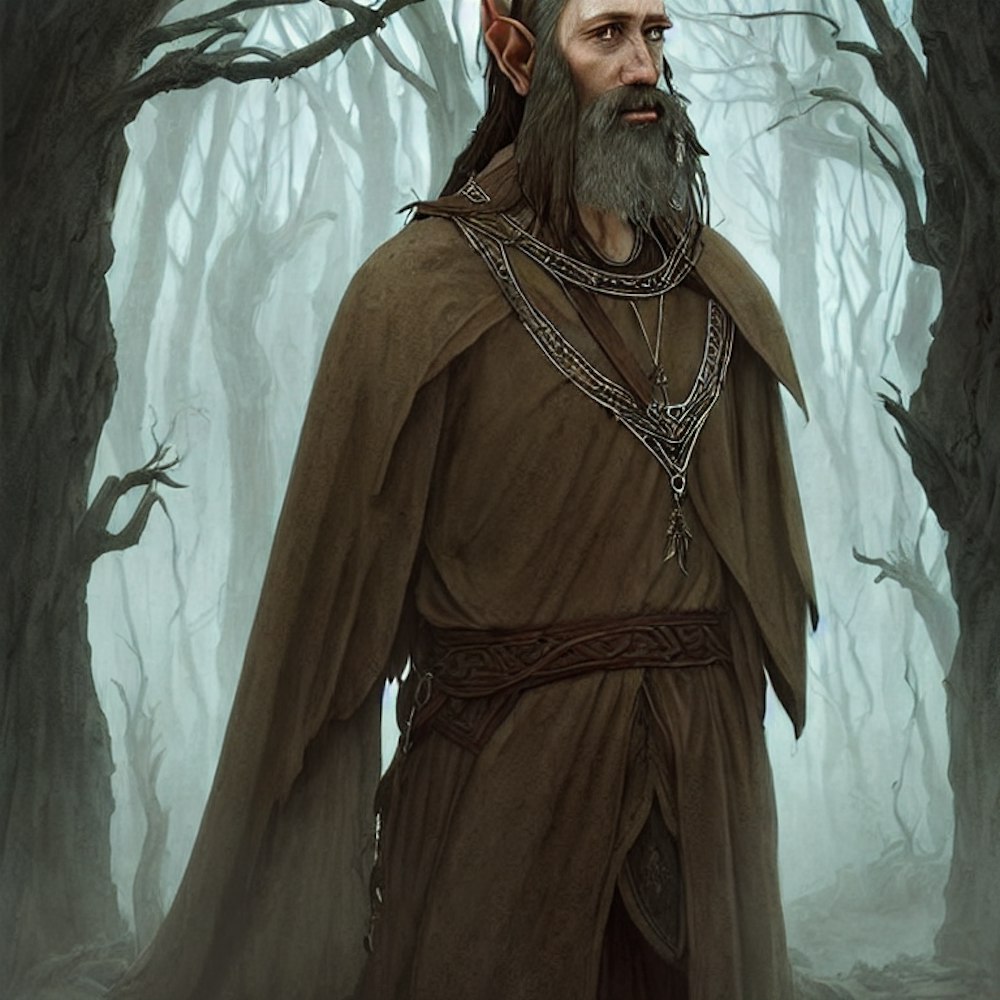 An old wood elf priest and leader of a religion, with a long beard and a double triangle pendant around his neck in the form of a triangle. And is very charismatic and very handsome.