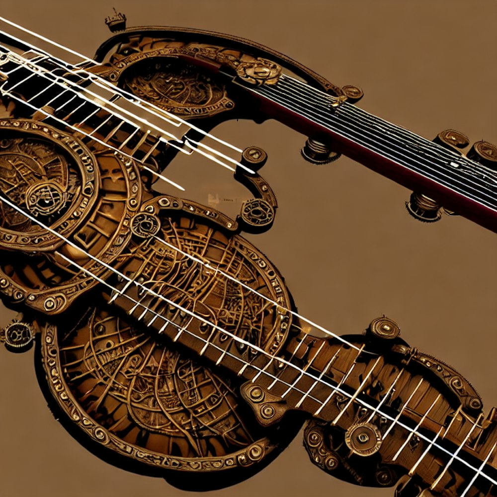Steampunk theme, a 8 STring guitar with Scottish bagepipe, steamtrain
