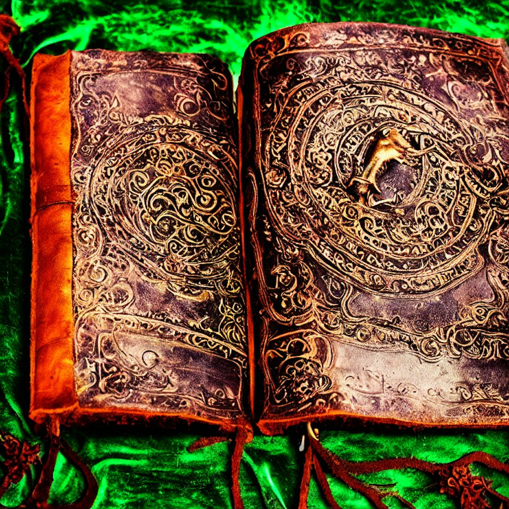 A realistic photo of an old sacred magic book made of leather, in the middle of the image, laying over a green velvet wrapped background