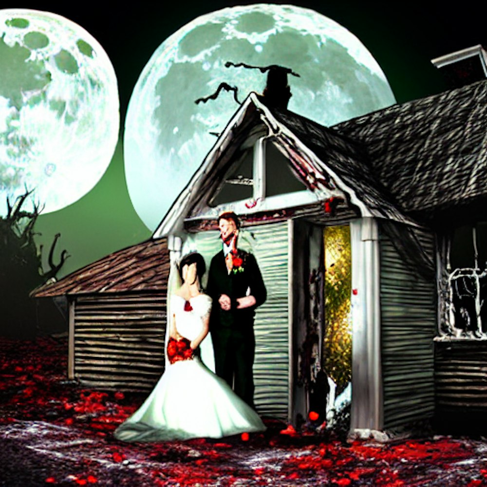 Zombie wedding, cinematic cottage on the moon