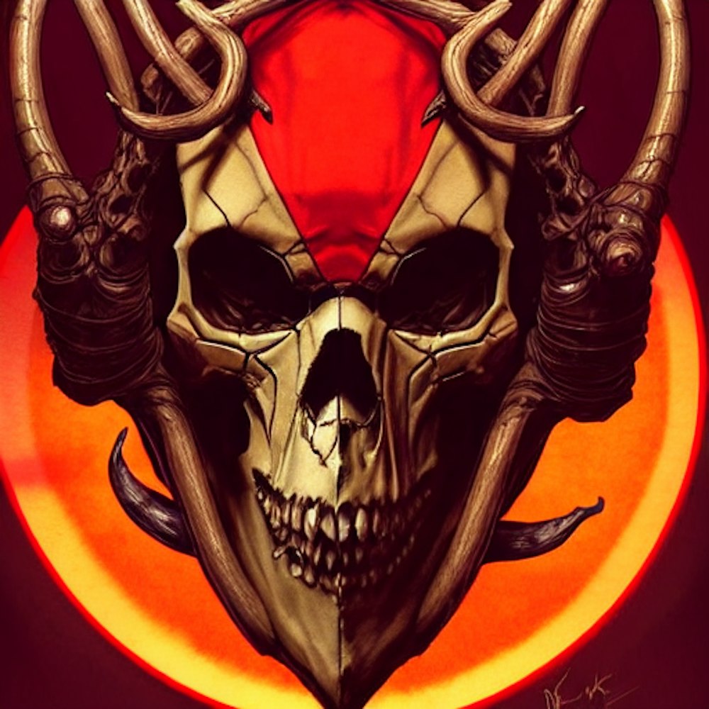 Doom in a red cape, skull face, orange antlers, black staff with snake wrapped around, desert. intricate, Centered. Dittmann, Artgerm, WLOP, Mucha. Concept art. Planets, Space. Dynamic lighting. Regal. Bagshaw, Chevrier, Ferri, Kaluta, Minguez, Johansson