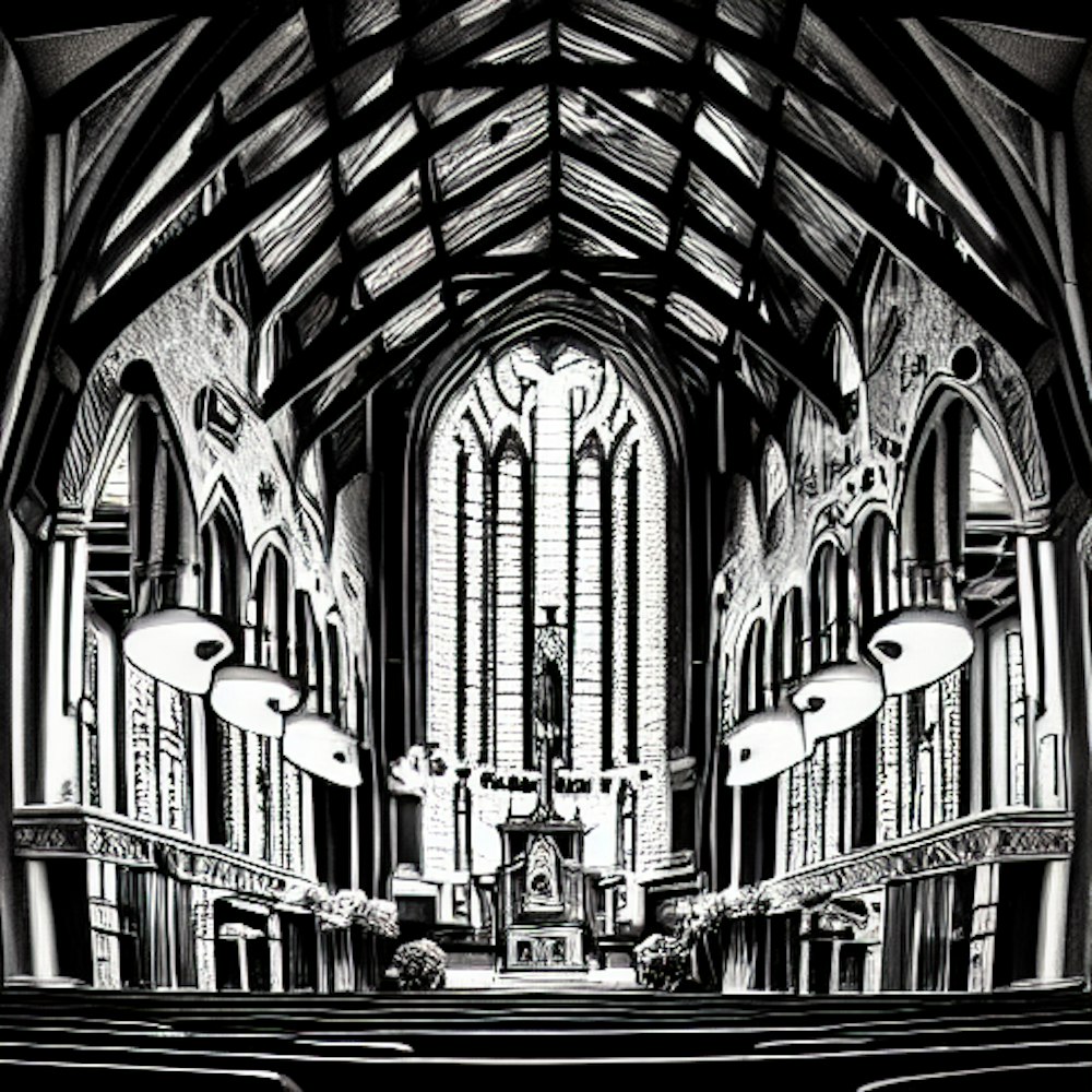 Picture to a different dimension, church, fire, Pentecost, black and white, fine detail