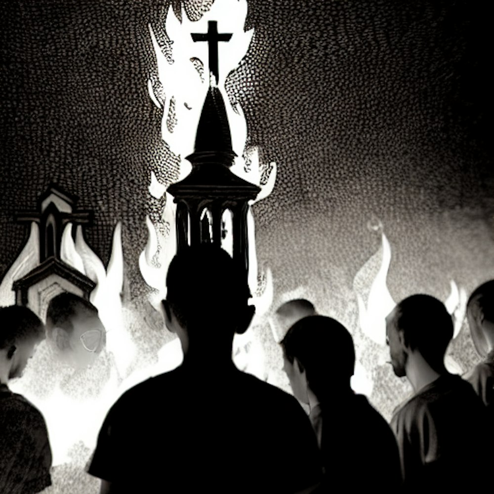 Picture to a different dimension, church, fire, Pentecost, black and white, fine detail, fire on head, people