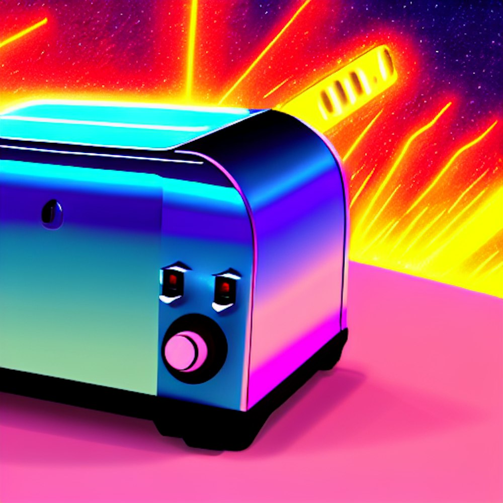 toaster flying in the space with synthwave colors combination, high details, super realistic, 8k