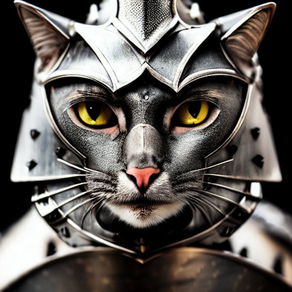 kneeling cat knight, portrait, finely detailed armor, intricate design, piercing eyes, silver, silk, 50mm photography, cinematic lighting, 4k