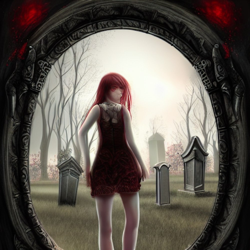 girl, mirror, blood, Sweet dreams, Cemetery landscape, hyper detailed, intricate design, concept art, Unreal engine