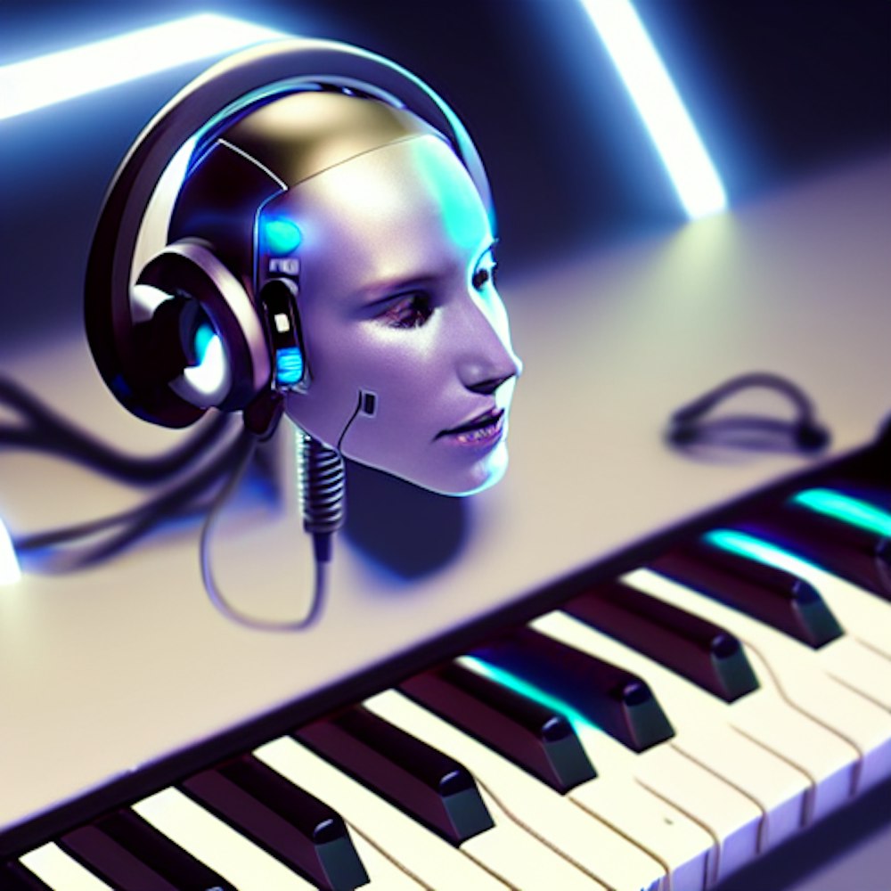 a cyborg using a keyboard and headphones