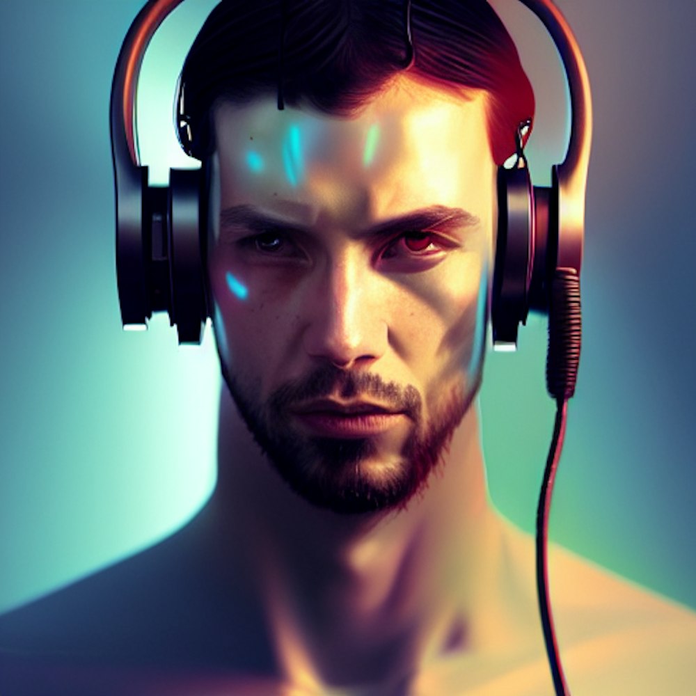 a cyborg man standing with headphones on and half his face is electronics