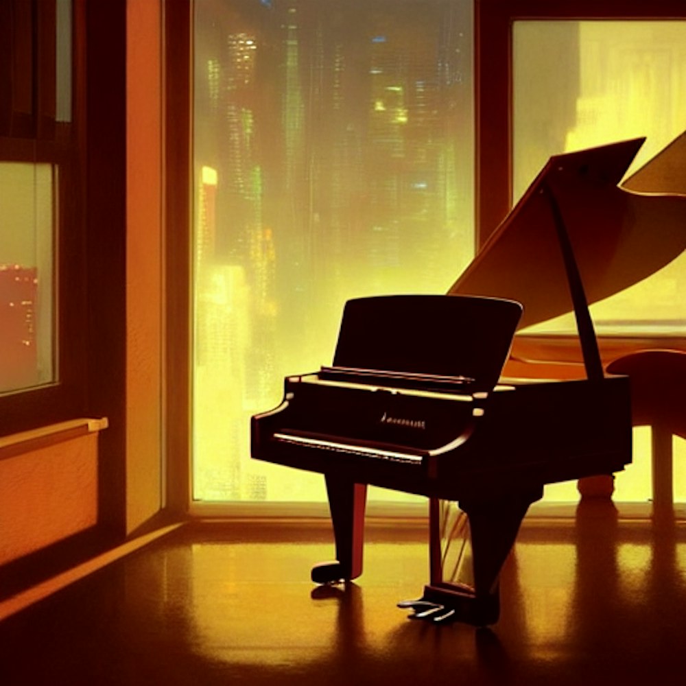 Fox with a piano in front of a window at night