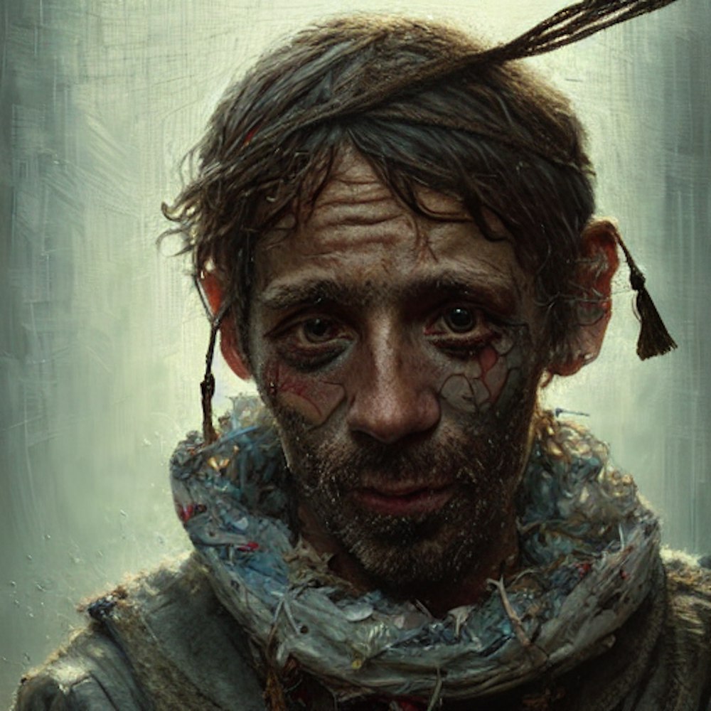 homeless man wearing a raggedy torn graduation gown while wandering the city