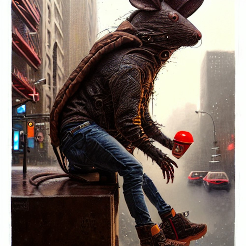 humanoid rat wearing timberland boots. baggy jeans and a bubble jacket while being in new york streets
