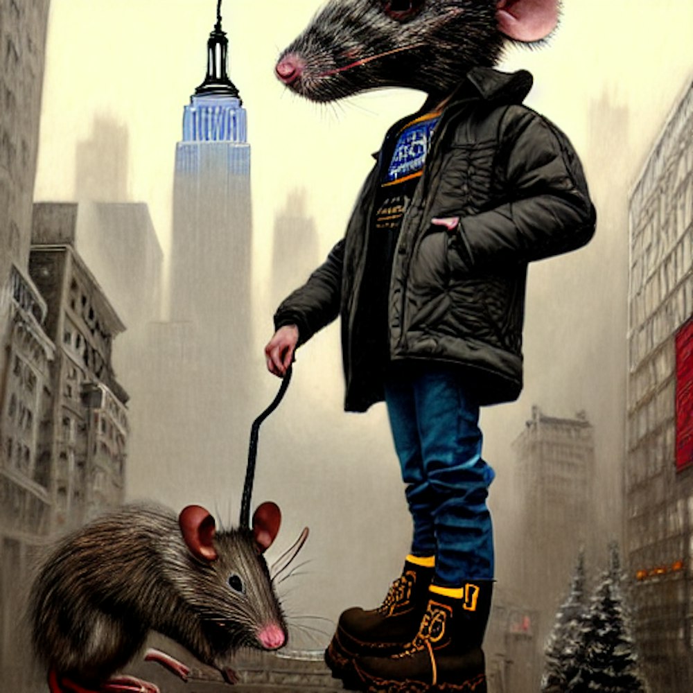 humanoid rat wearing timberland boots. baggy jeans and a puffer jacket with a NY hat on it's head while being in new york streets