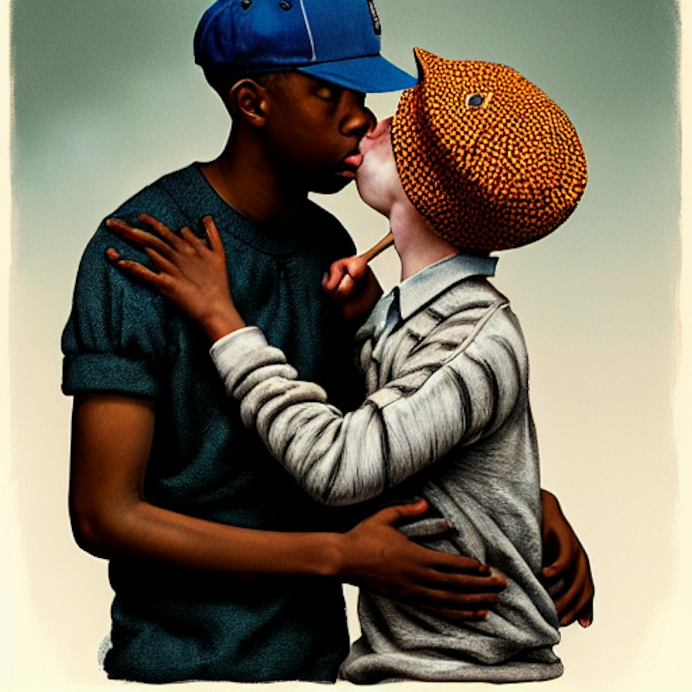 Tyler the creator wearing a hat while kissing a pale white boy with curly hair and freckles