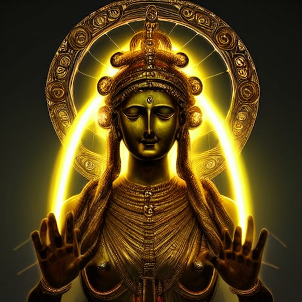 Light springs around the head of the Goddess, her hands hold the souls of humanity, like little balls of fire