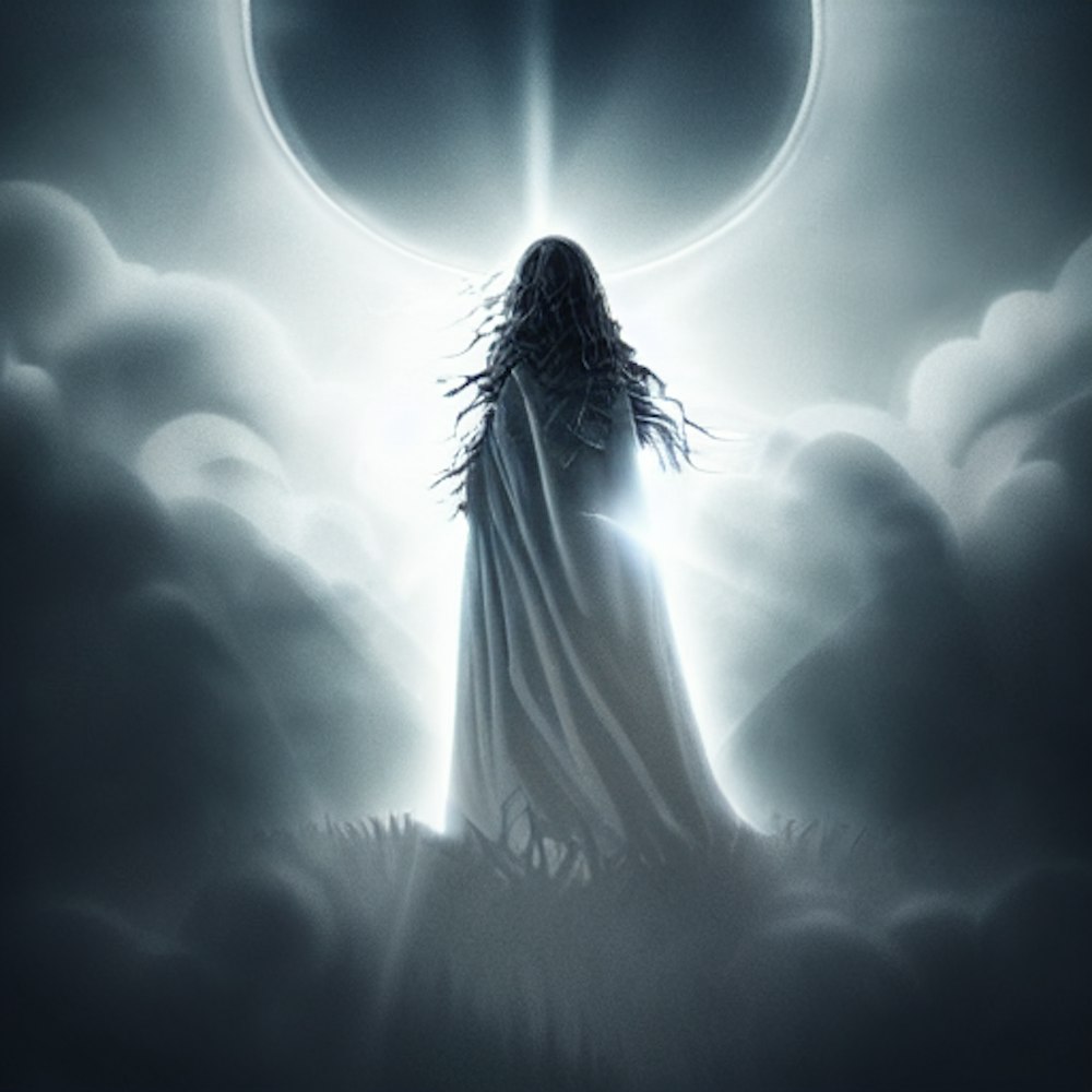 A nimbus of heavenly light shines around the head of the Chosen One, she is a fearless witch alone in a field of shadows