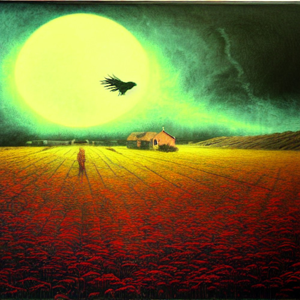 Raven, eclipse, red sky, farm, horror, cornfield, by Ayami Kojima, beksinski, Amano, Francisco Goya, Beksinski painting, Adrian Ghenie, Takato Yamamoto. Greg Rutkows, detailed, classicism, intricate, detailed. jean pierre ugarte, albert bierstadt, karl he
