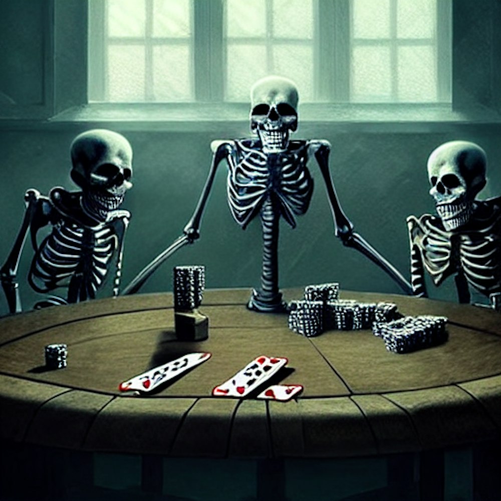 Skeletons sitting around a table playing cards