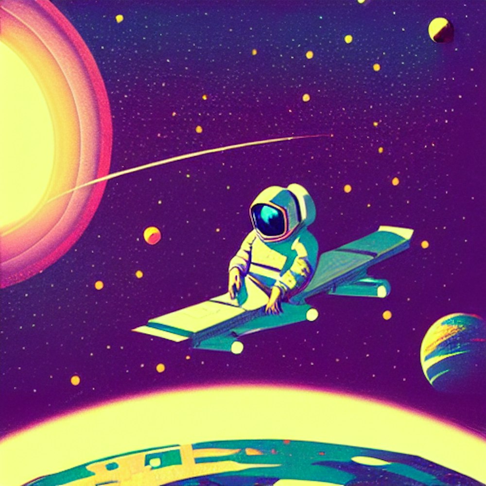 retro, illustration, pop art, grainy, planets, stars, astronaut