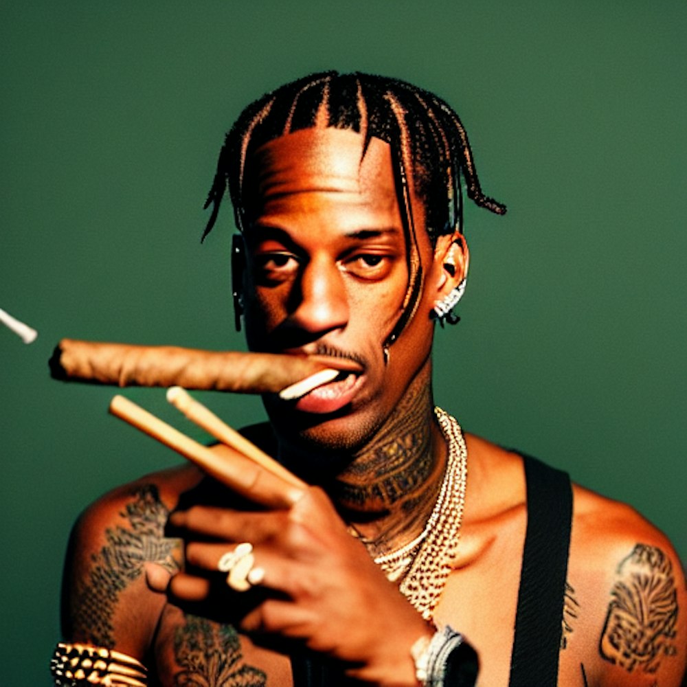 Travis Scott with a cigar in his mouth on the west coast, dark background