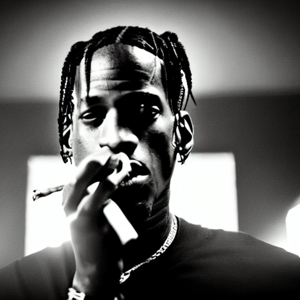Travis Scott with a cigar in his mouth on the west coast, dark background