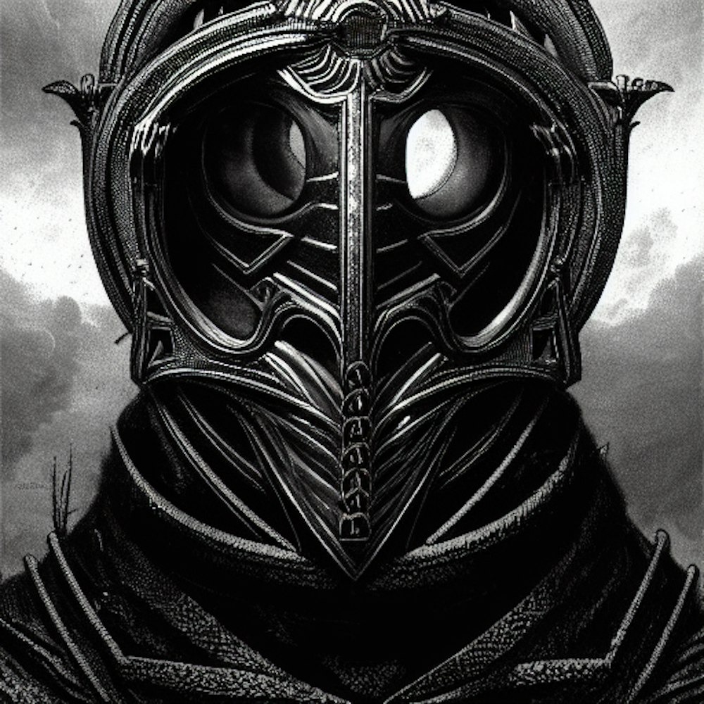 A profile of a black man with a black metal futuristic mask that’s and silver high resolution 50mm.