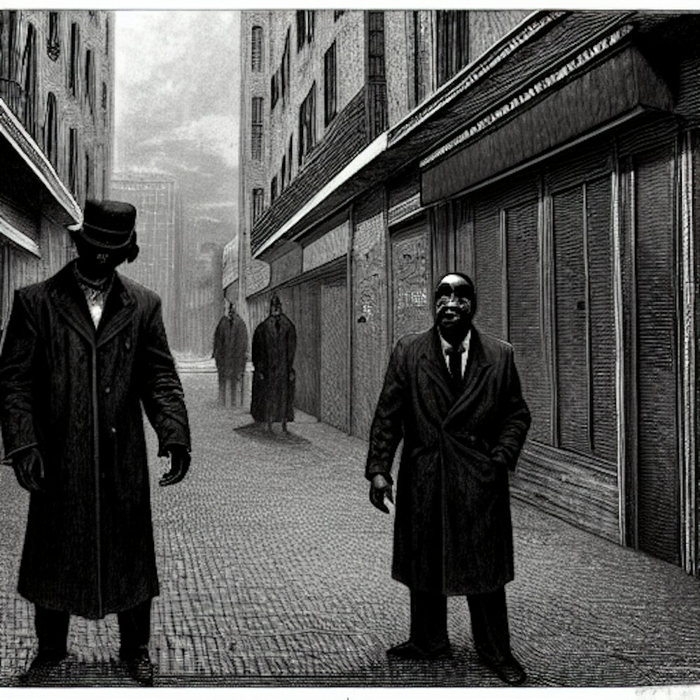 A full color cinematic scene of 2 black men dressed like mobb boss in the Bronx selling drugs in a building by the police station.high resolution 50mm.