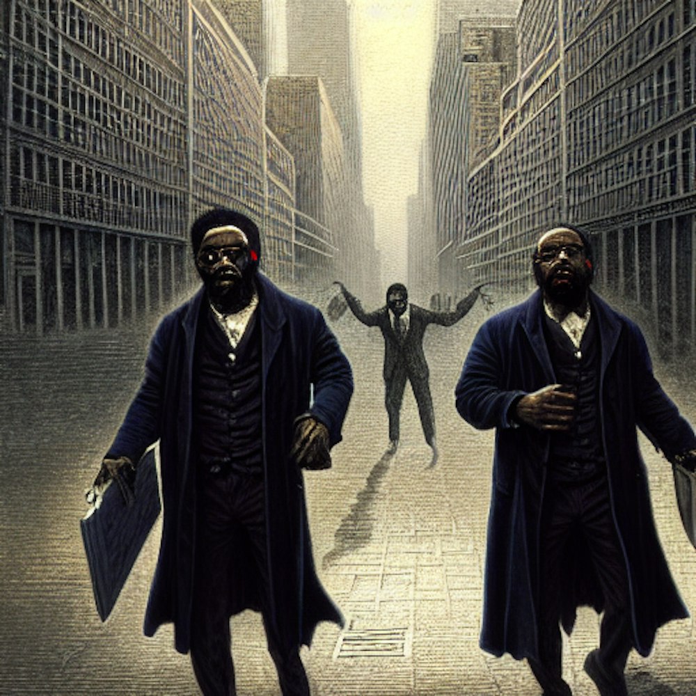 A full color cinematic scene of 2 black men dressed like mobb boss in NewYork city selling drugs in a building by the police station.high resolution 50mm.