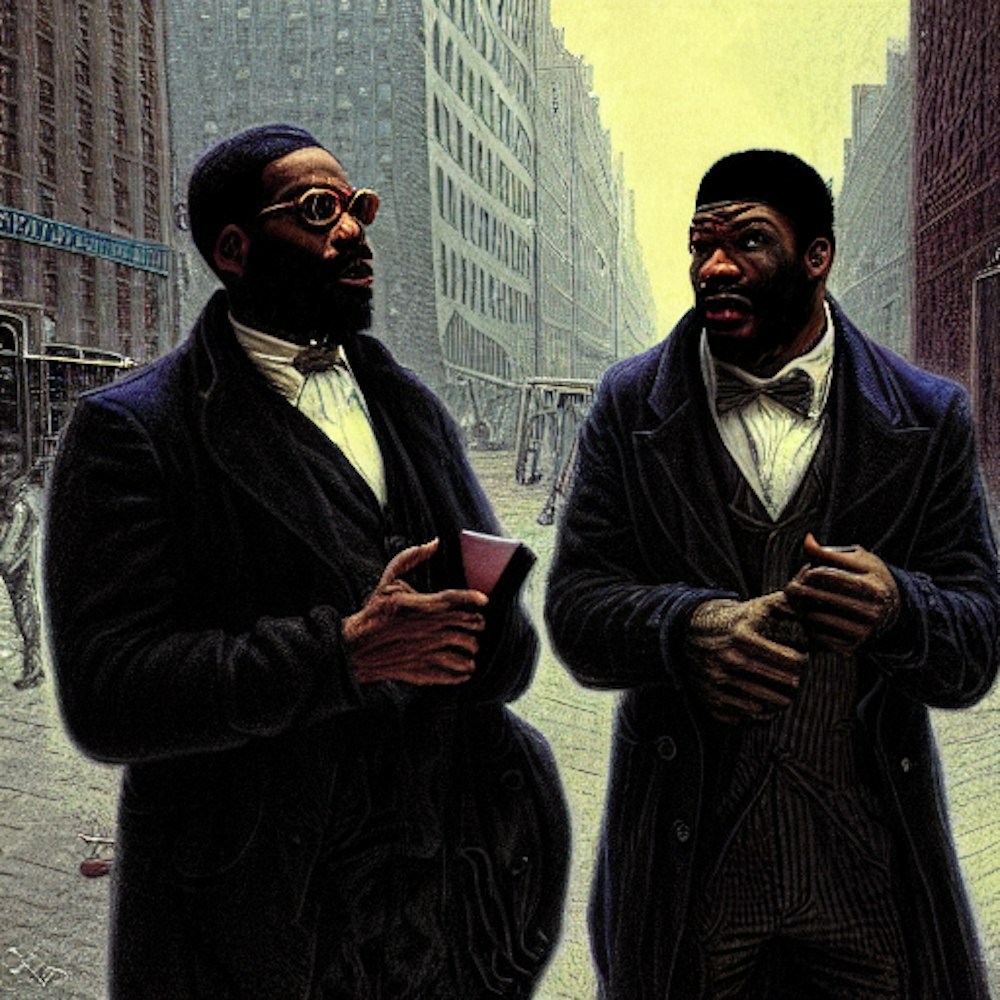 A full color cinematic scene of 2 black men dressed like mobb boss in NewYork city selling drugs in a building by the police station.high resolution 50mm.