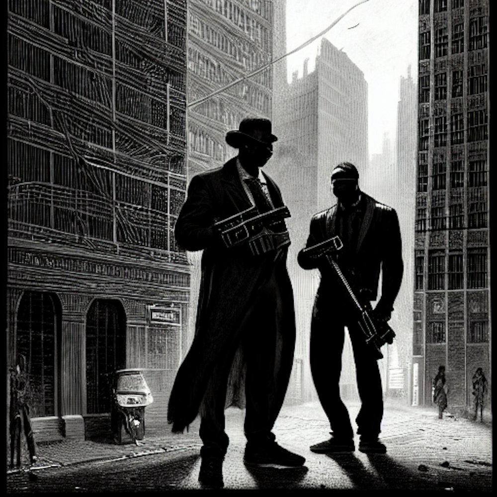 A  colorful cinematic scene of  2 black men with guns dressed like mobb bosses in NewYork city  selling drugs in a building by the police station.high resolution 50mm.