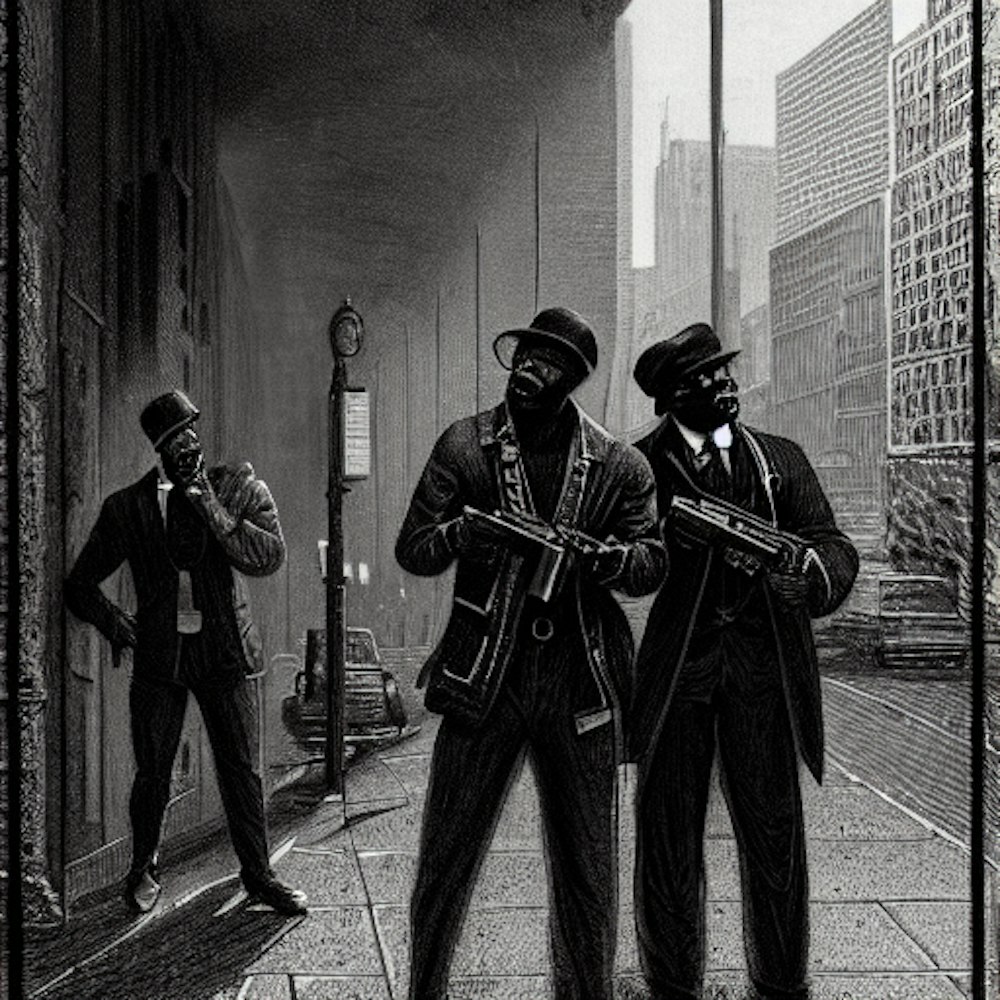 A  colorful cinematic scene of  2 black men with guns dressed like mobb bosses in NewYork city  selling drugs in a building by the police station.high resolution 50mm.
