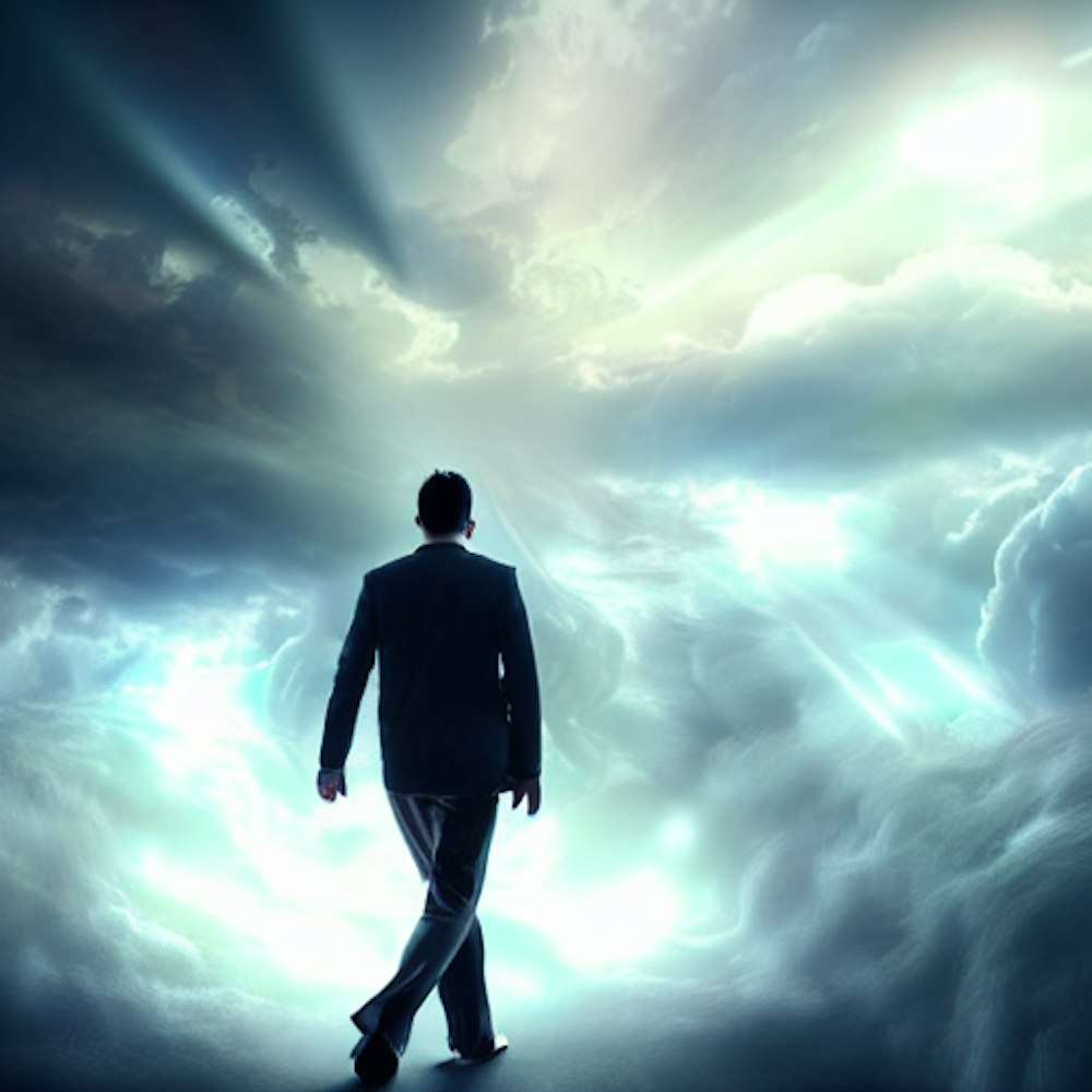 a man is walking on a cloud, surrounded by music harmony