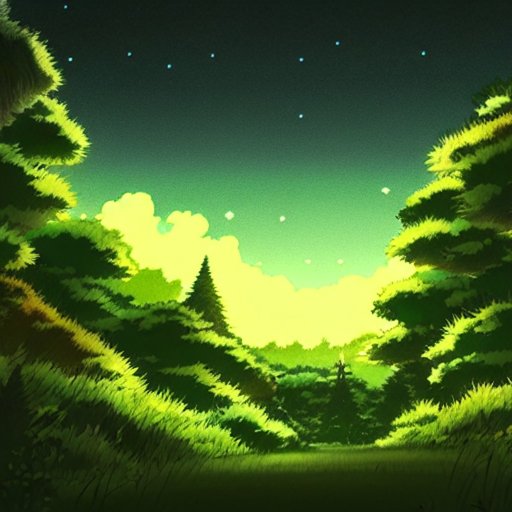 studio ghibli style, lofi, night sky, forest, no people