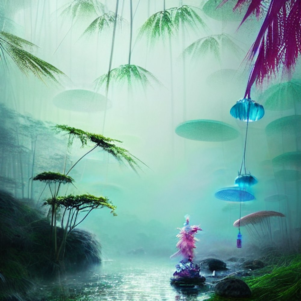 foggy hazy bamboo trees forest, flowers moss, stones, floating glowing paper lanterns