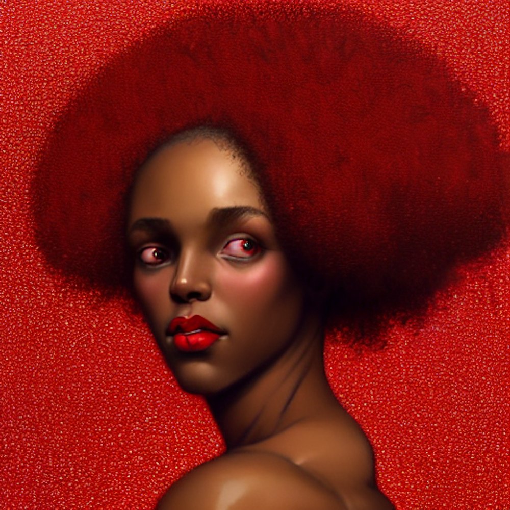 Black woman with �heart shaped Afro and red dress�